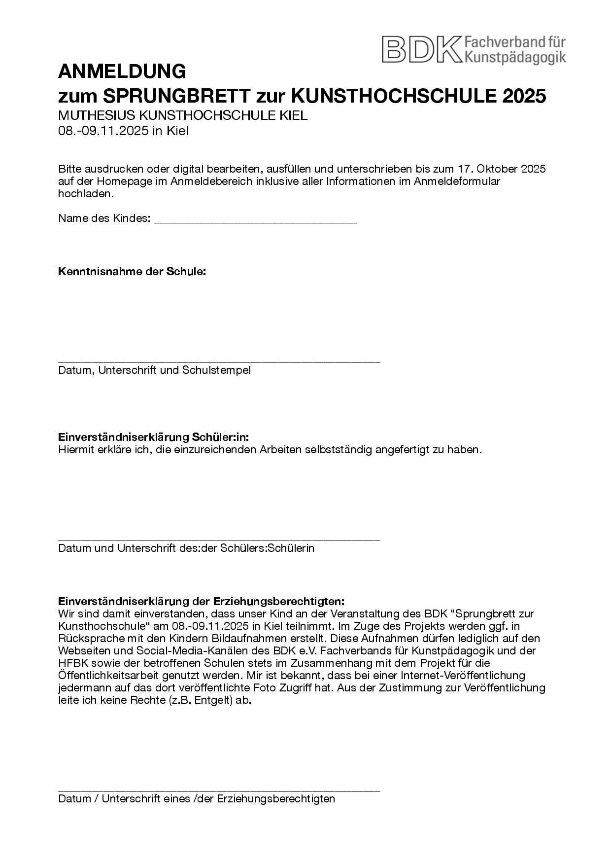 Schön, dass du beim Sprungbrett mitmachen willst. Du benötigst 3-5 eigene Arbeiten, die du später digital einreichen musst. Melde dich nun aber zuerst hier (siehe unten) mit deinen Kontaktdaten an. Hierzu benötigst du auch dieses ausgefüllte und unterschriebene Formular, das einen Stempel deiner Schule enthält, deine Unterschrift dazu, dass du die Arbeiten selbständig erstellt hast, sowie ggf. (wenn noch nicht volljährig) die Unterschrift deiner Eltern: