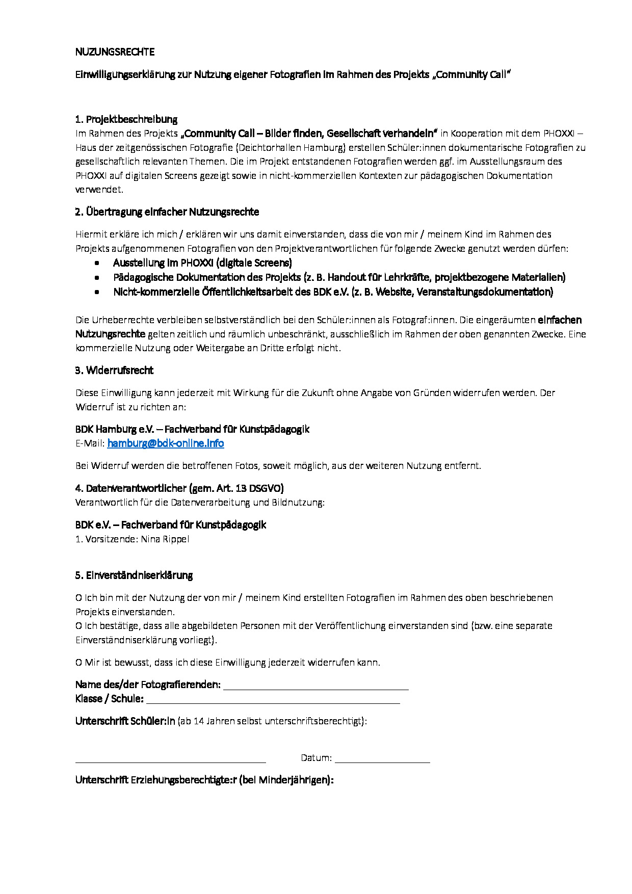 - Einverständniserklärungen zu Bild- und Persönlichkeitsrechten (Für alle fotografierenden und abgebildeten Personen erforderlich – Formulare dafür werden zur Verfügung gestellt)