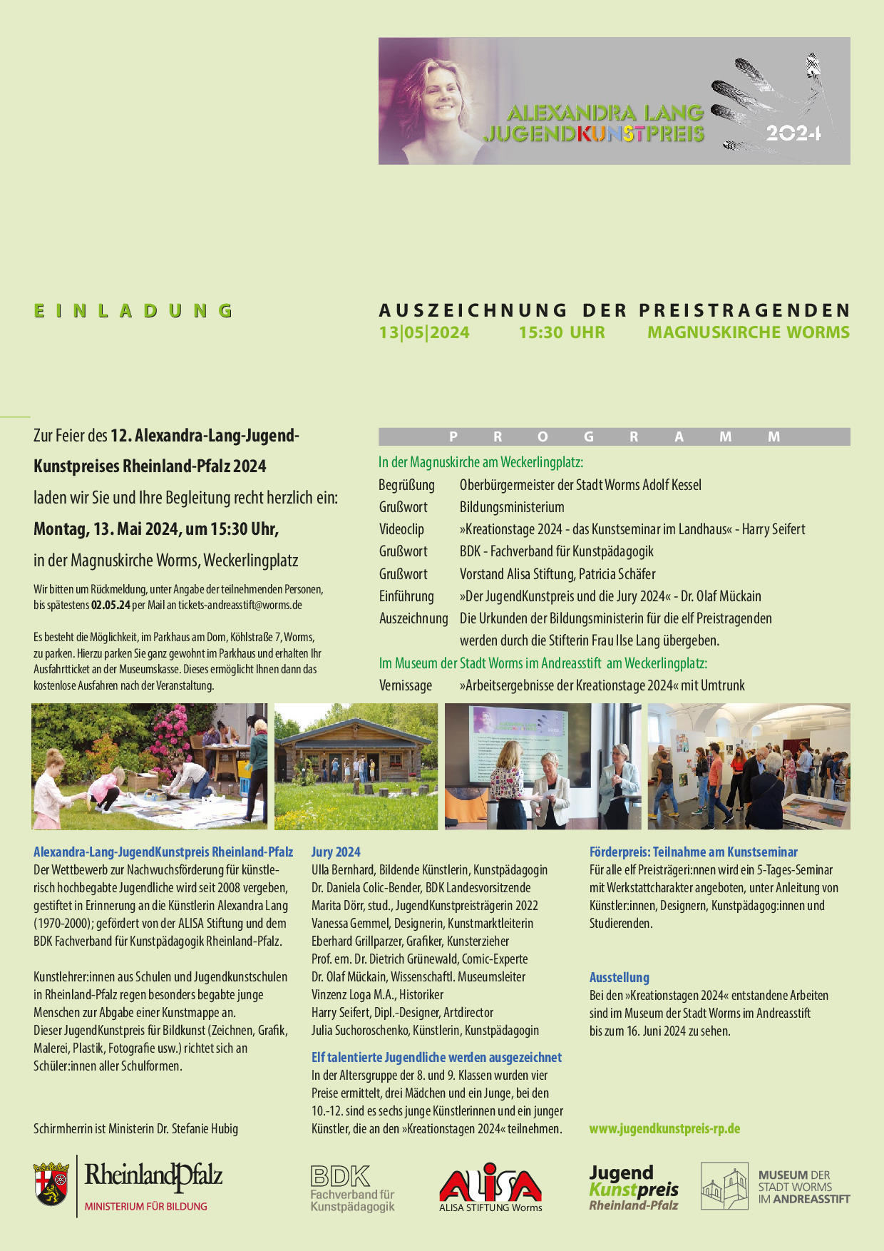 Wir laden alle Mitglieder herzlich ein, an der feierlichen Preisverleihung des Alexandra Lang Jugendkunstpreises teilzunehmen! Die Auszeichnung findet am 13.05.2024 um 15:30Uhr in der Magnuskirche Worms statt. Anmeldung bis zum 2.5.!