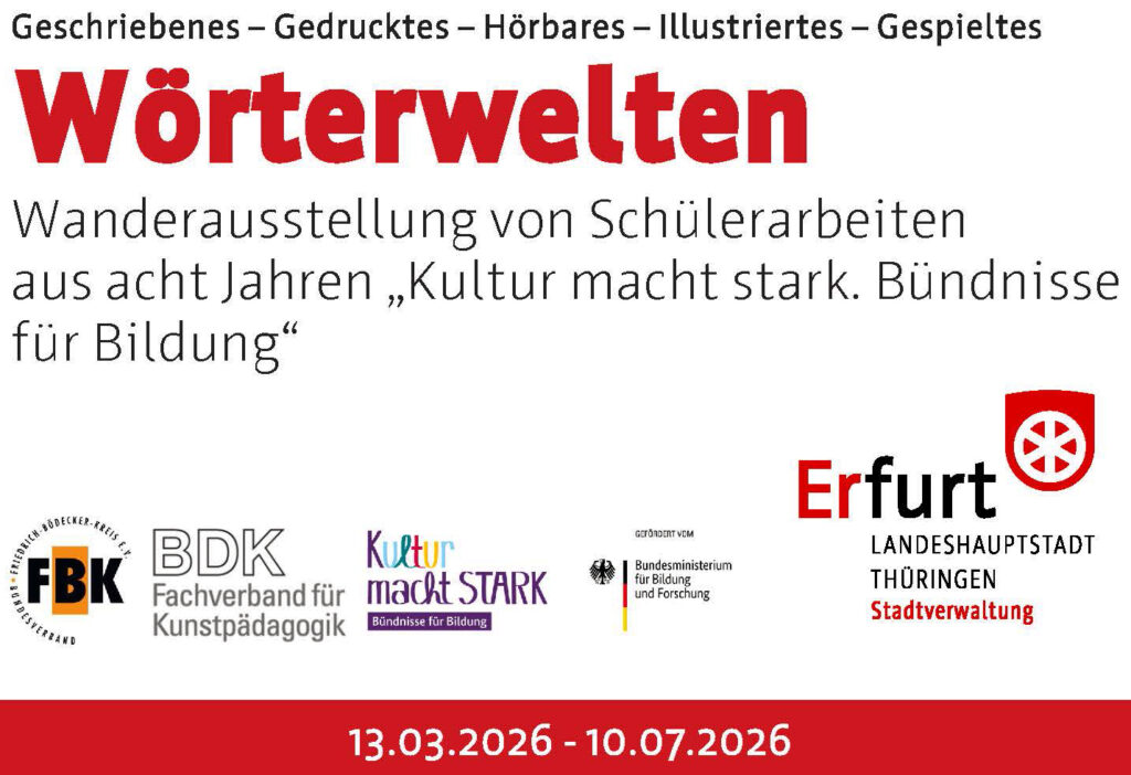 Im Ausstellungsprojekt Wörterwelten. Wanderausstellung zu Arbeiten von Schülern aus acht Jahren „Kultur macht stark“ in Sachsen und Thüringen wird deutlich, was entsteht, wenn Kreativität ernst genommen wird: Texte, Grafiken, Illustrationen, Drucke – dazu Filme, Theaterstücke und Podcasts, die persönliche Perspektiven sichtbar und hörbar machen.